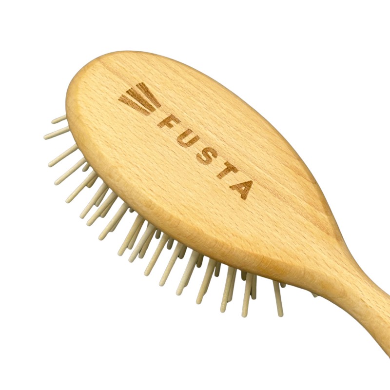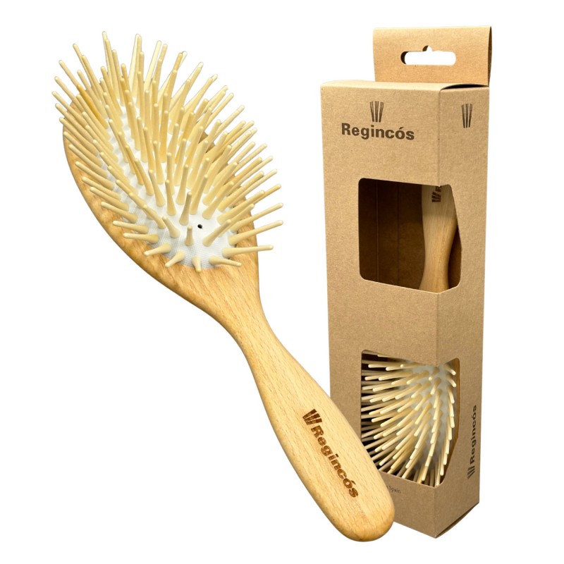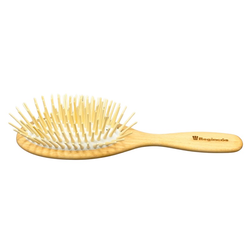 the Regincós FUSTA Oval L "Special pins" is suitable for long, thick hair, thanks to its longer wooden pins, which facilitate effective brushing without damaging the hair.